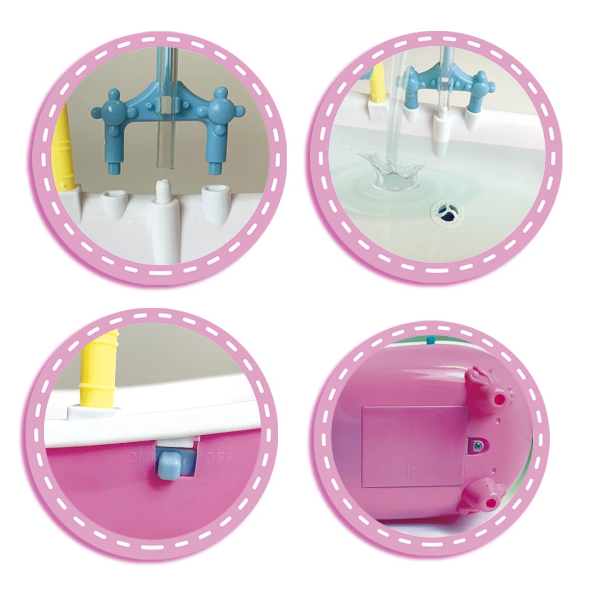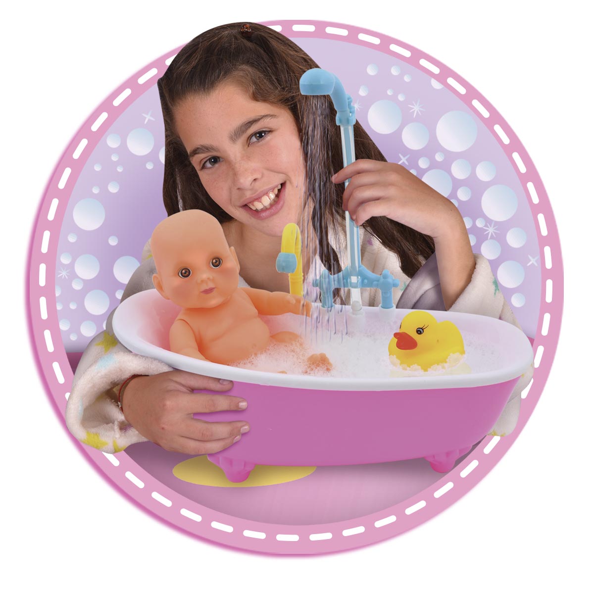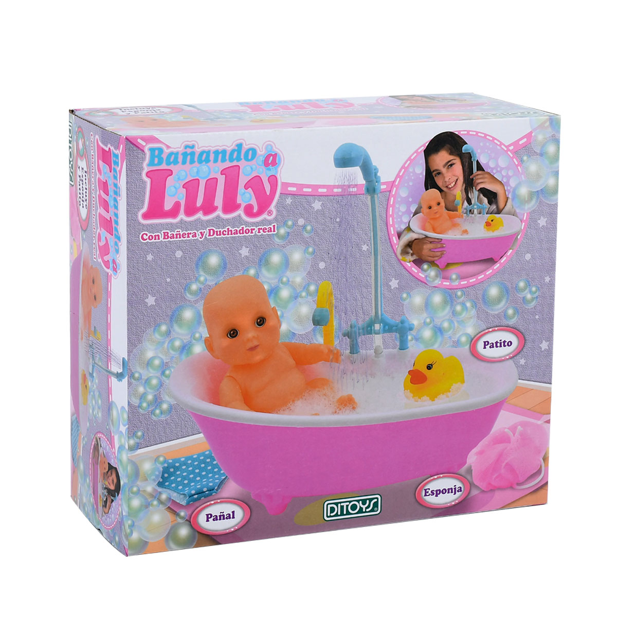 Contiene 1 muñeca Luly - 1 bañera - 1 esponja - 1 toallita - 1 patito - 1 mamadera La muñeca mide: 18 cms de alto.