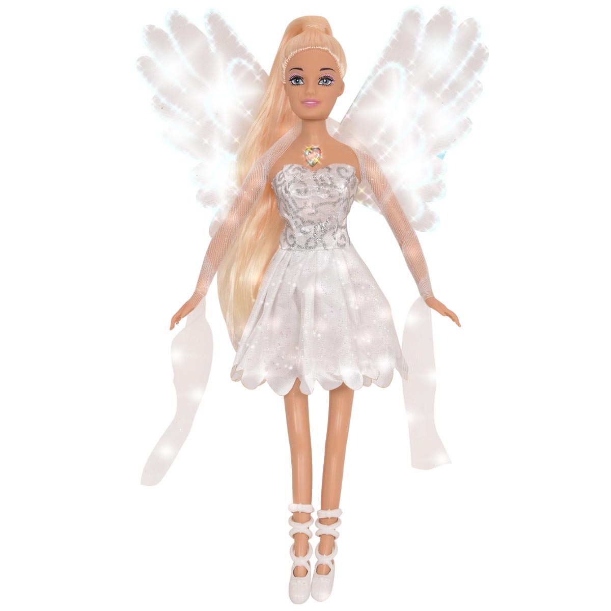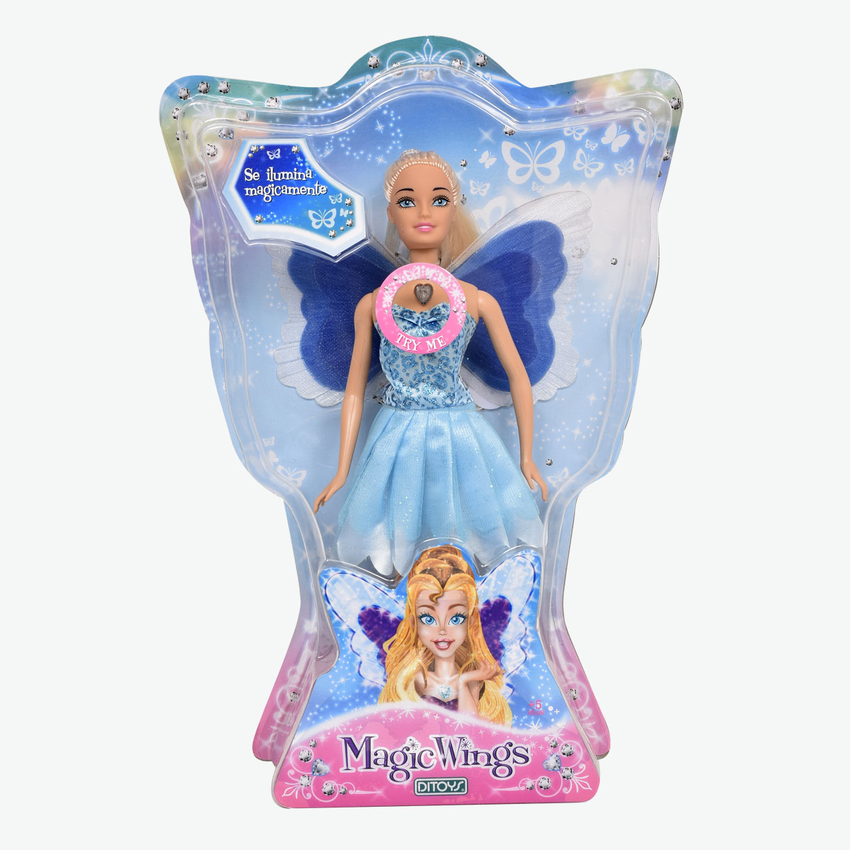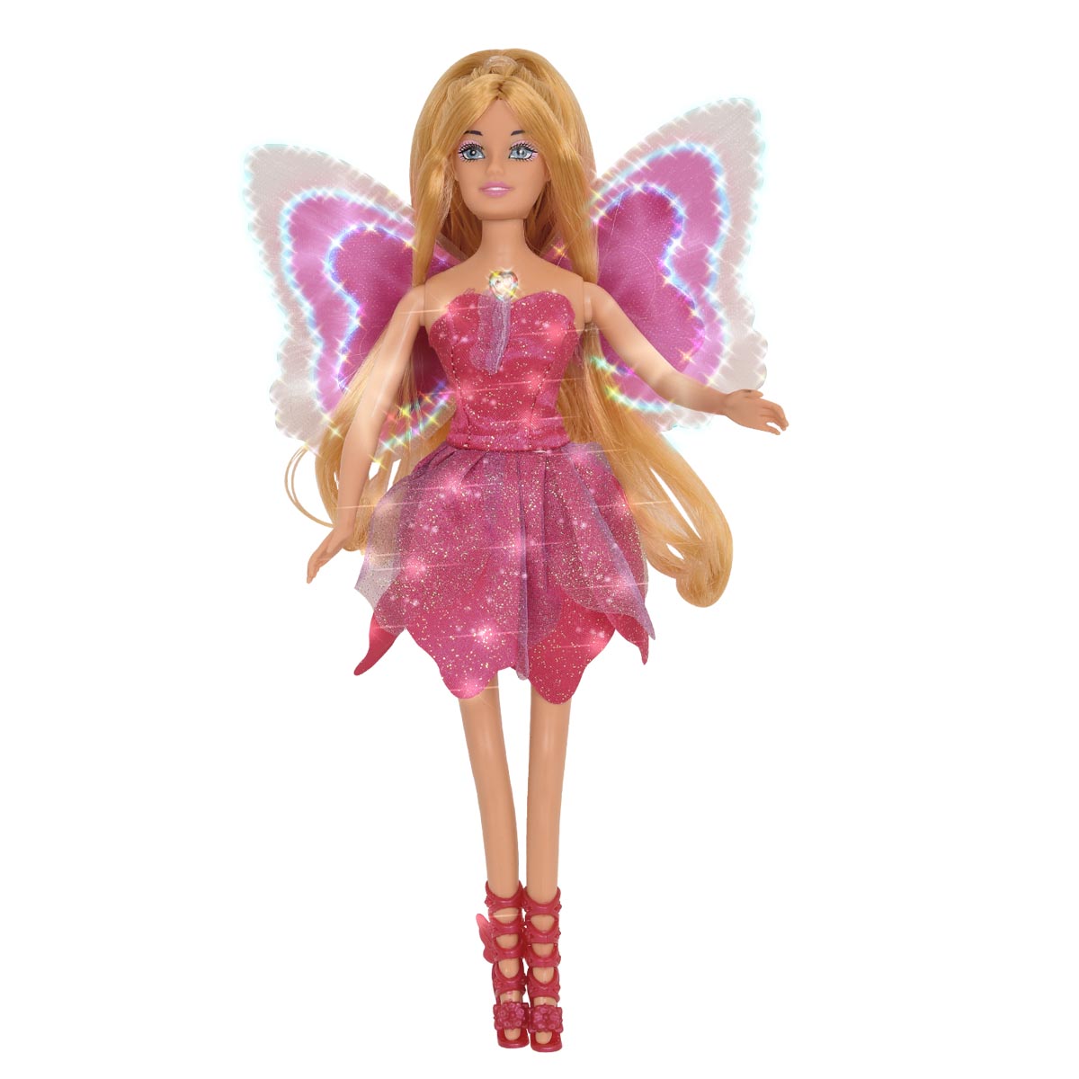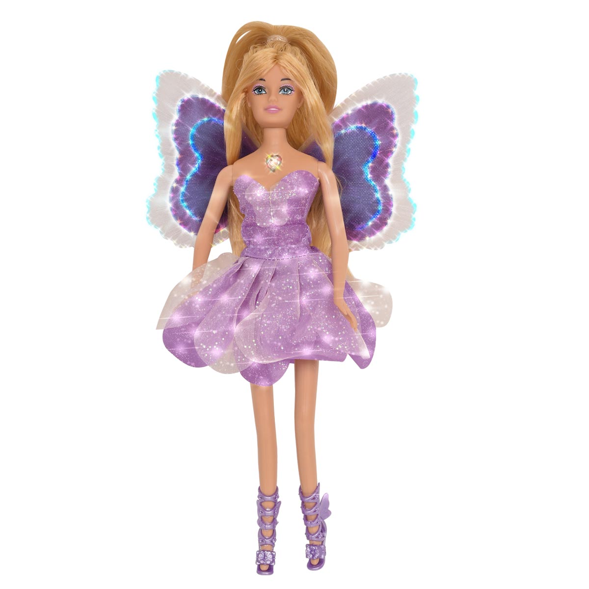 La muñeca Magic Wings se ilumina mágicamente presianando su corazón.