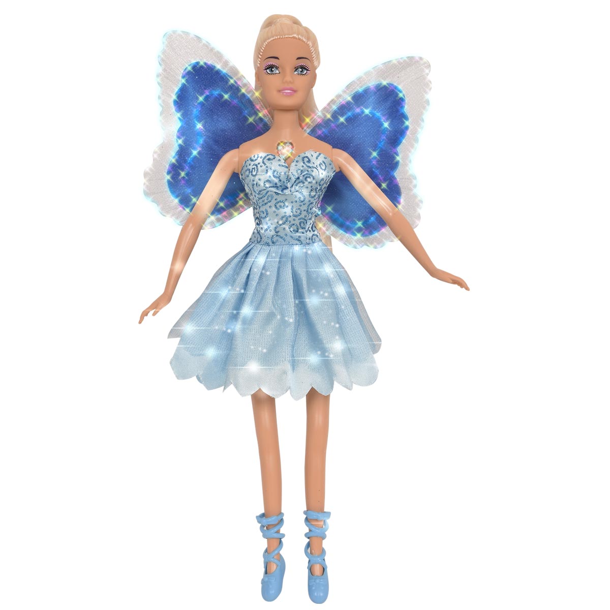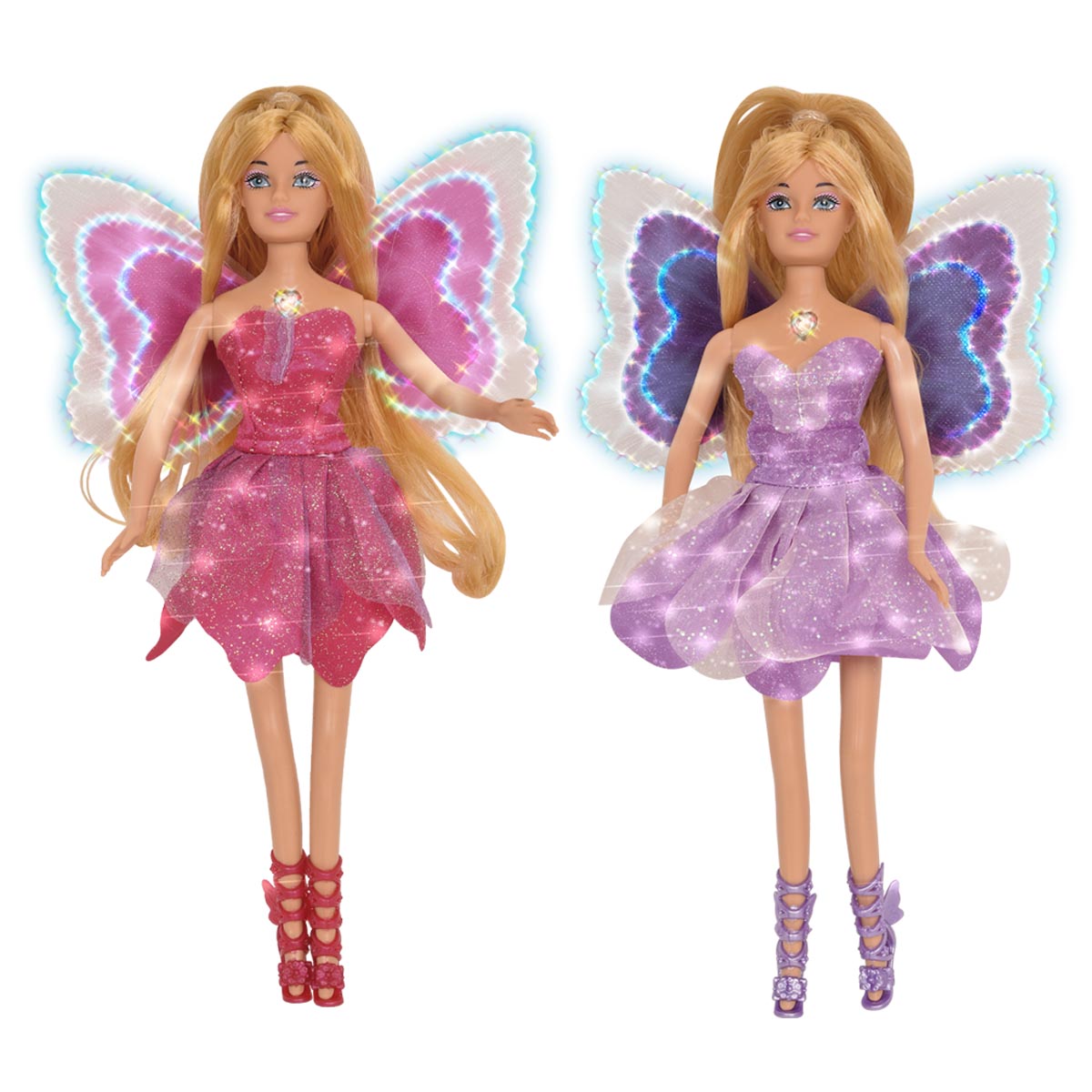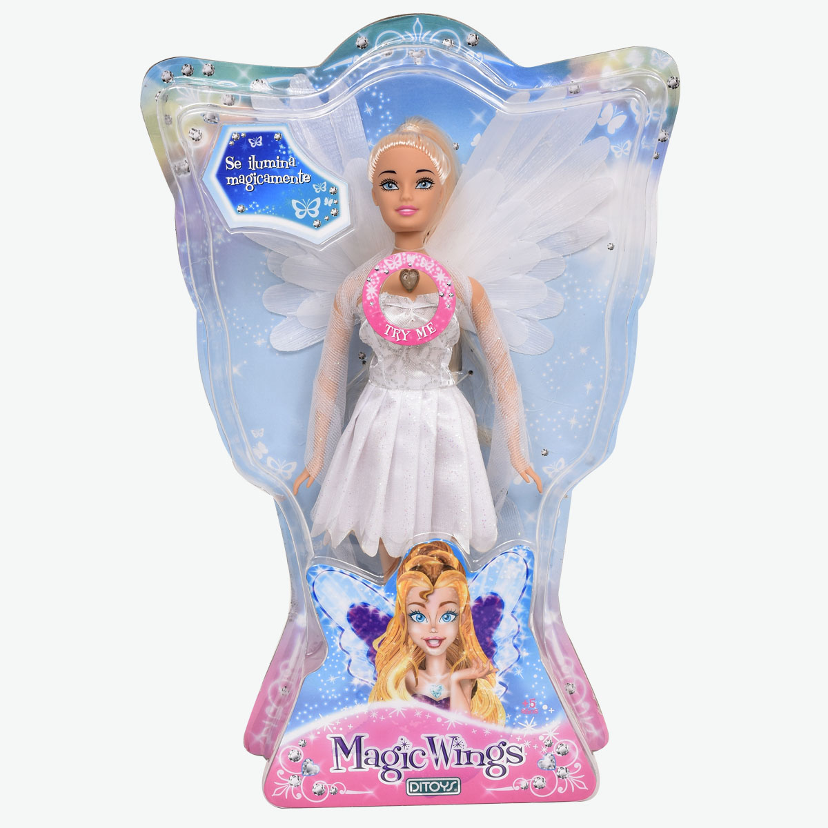 La muñeca Magic Wings se ilumina mágicamente presianando su corazón.