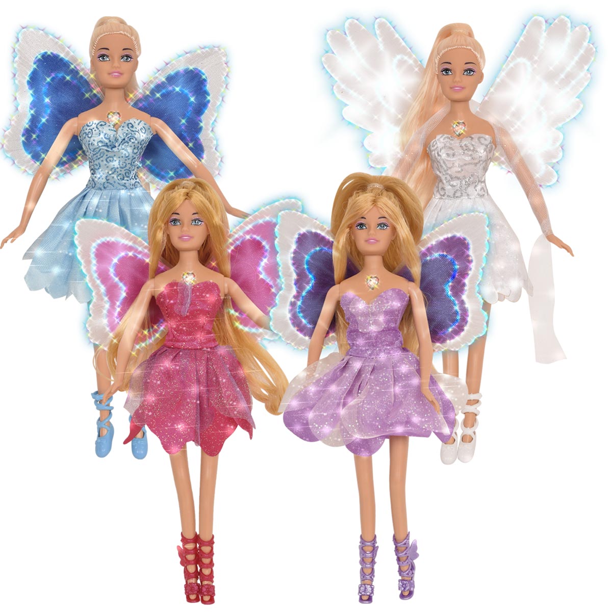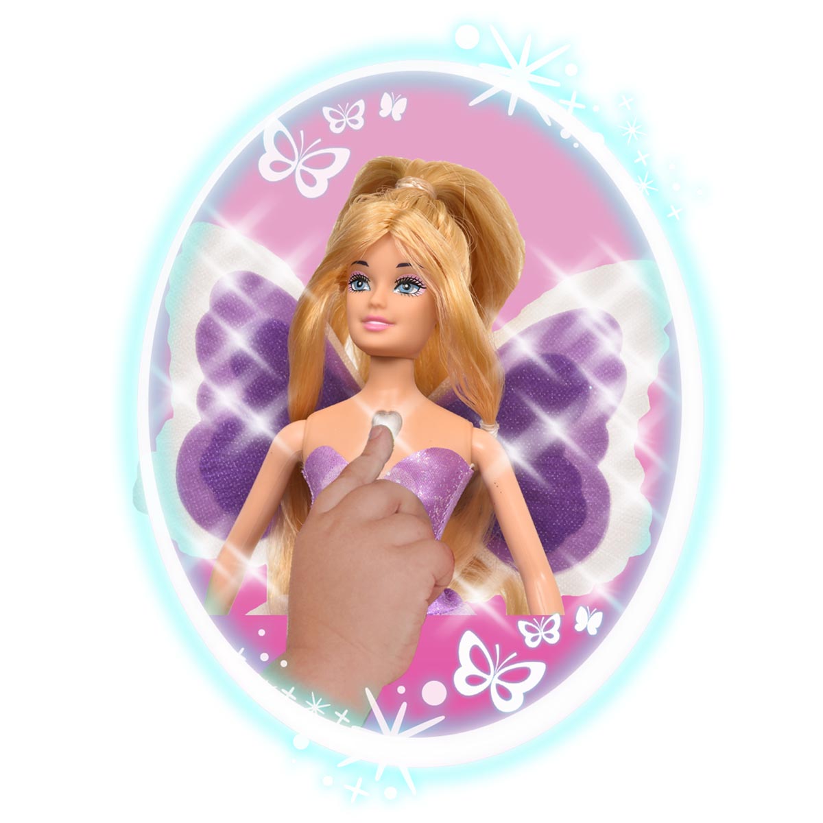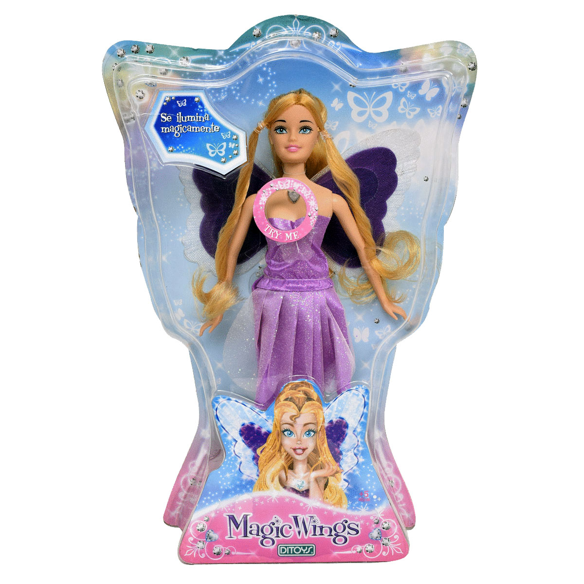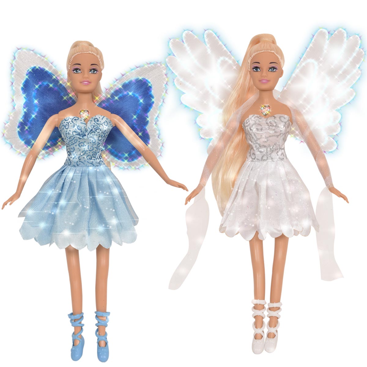 La muñeca Magic Wings se ilumina mágicamente presianando su corazón.