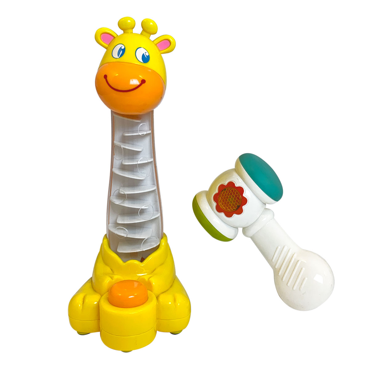Una tierna jirafita con bolitas tintineantes entretiene a su niño.