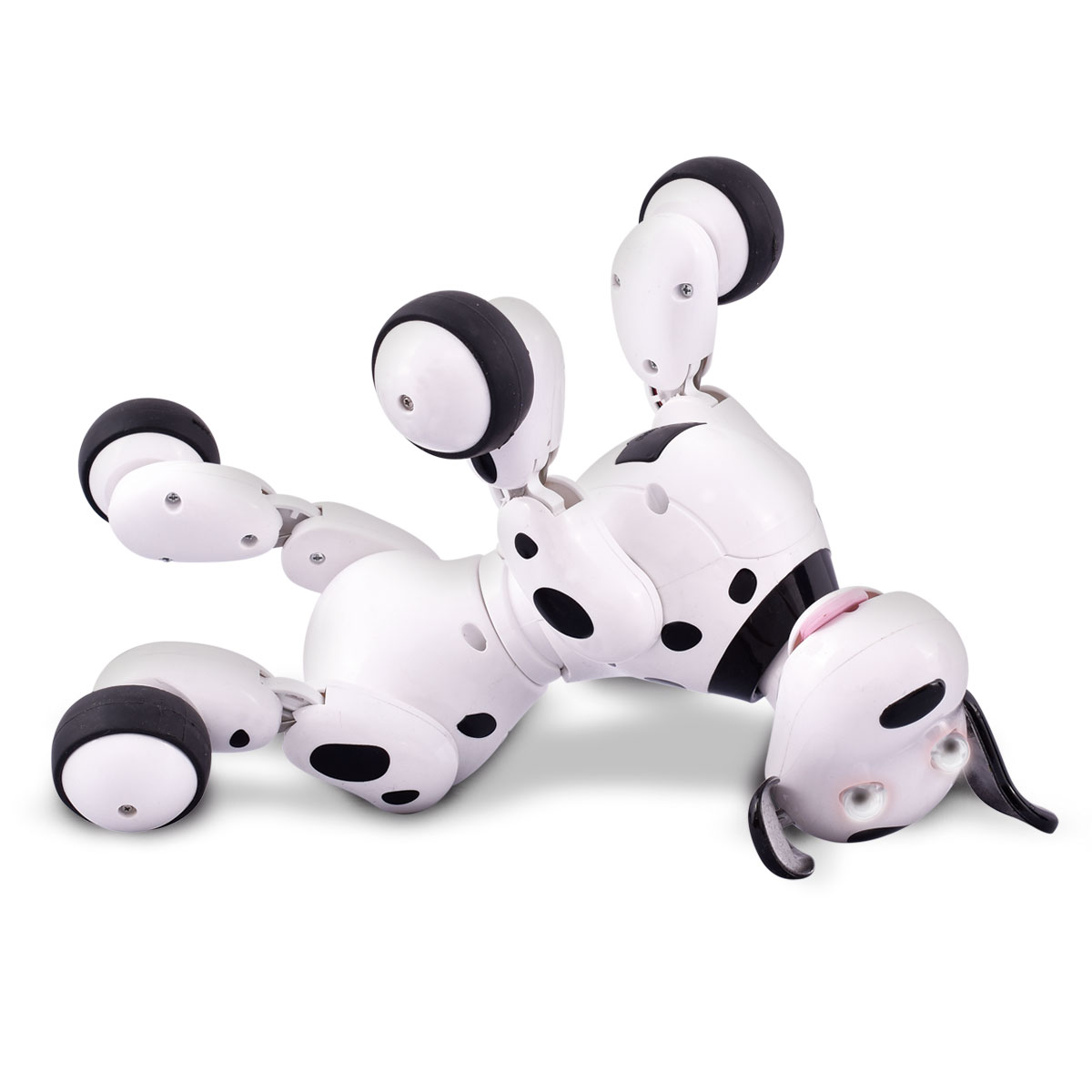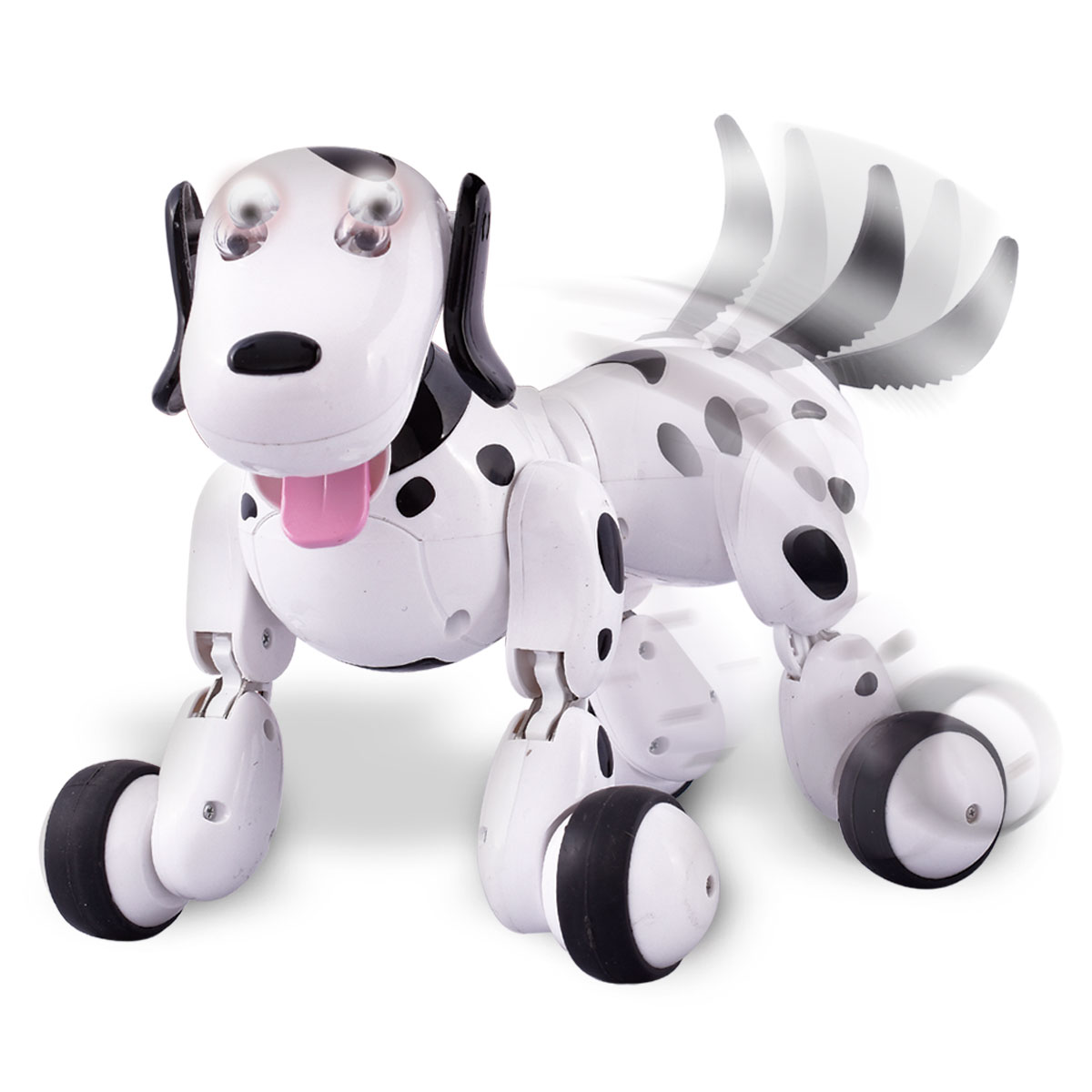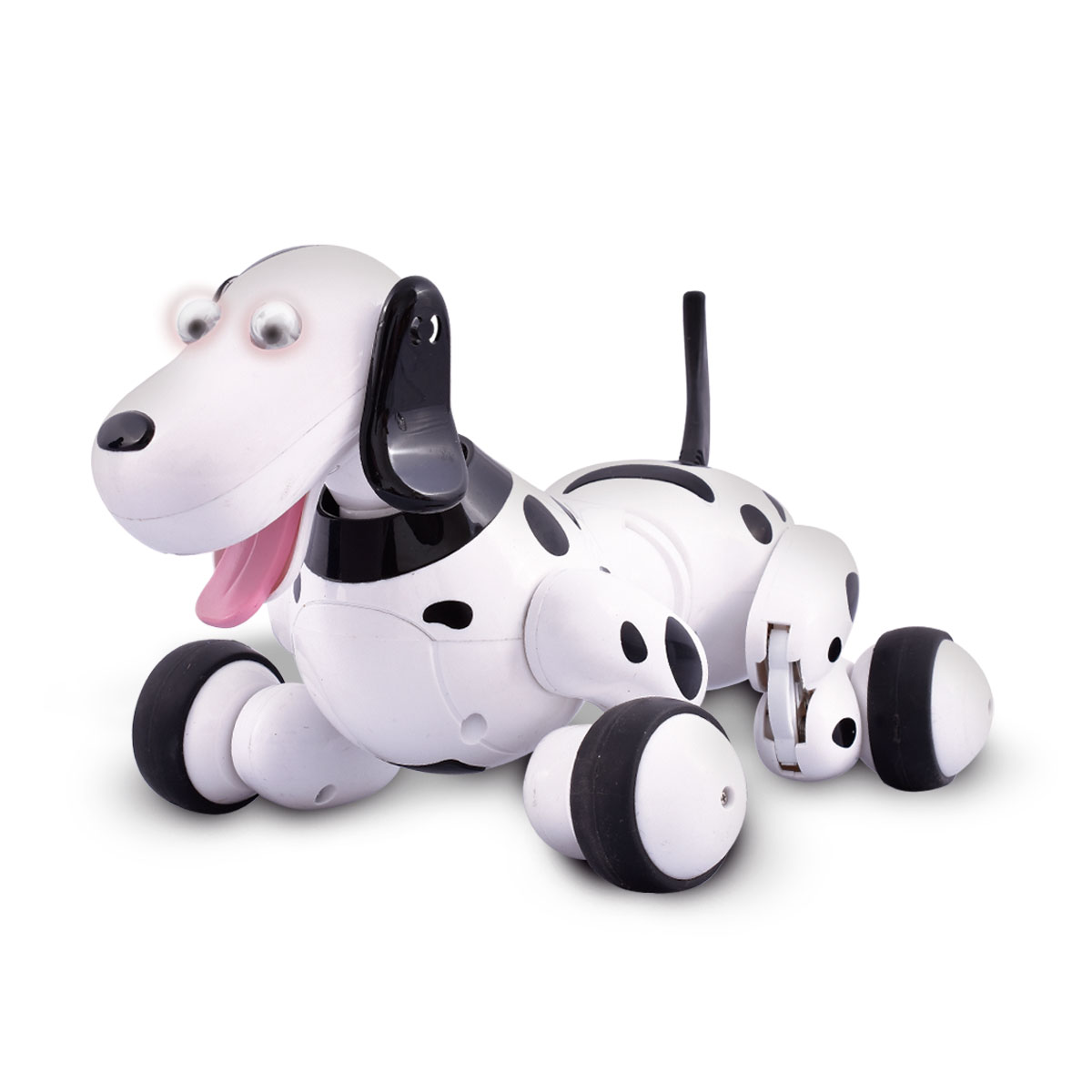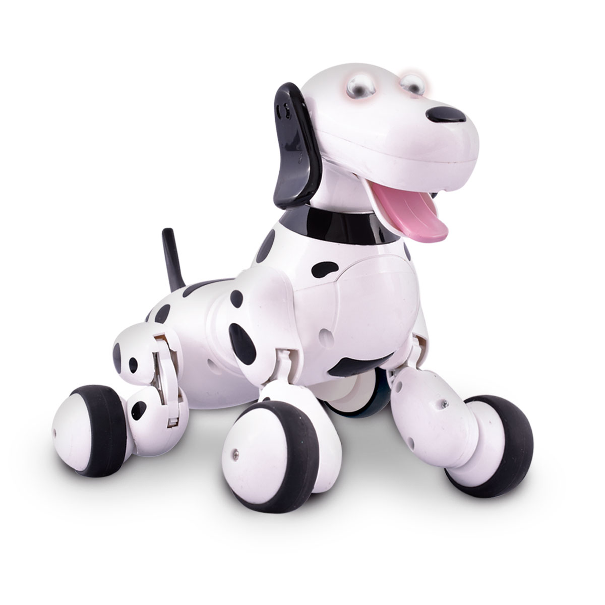 Ladra, gira, mueve su cola y puede girar y pararse como un perrito real.