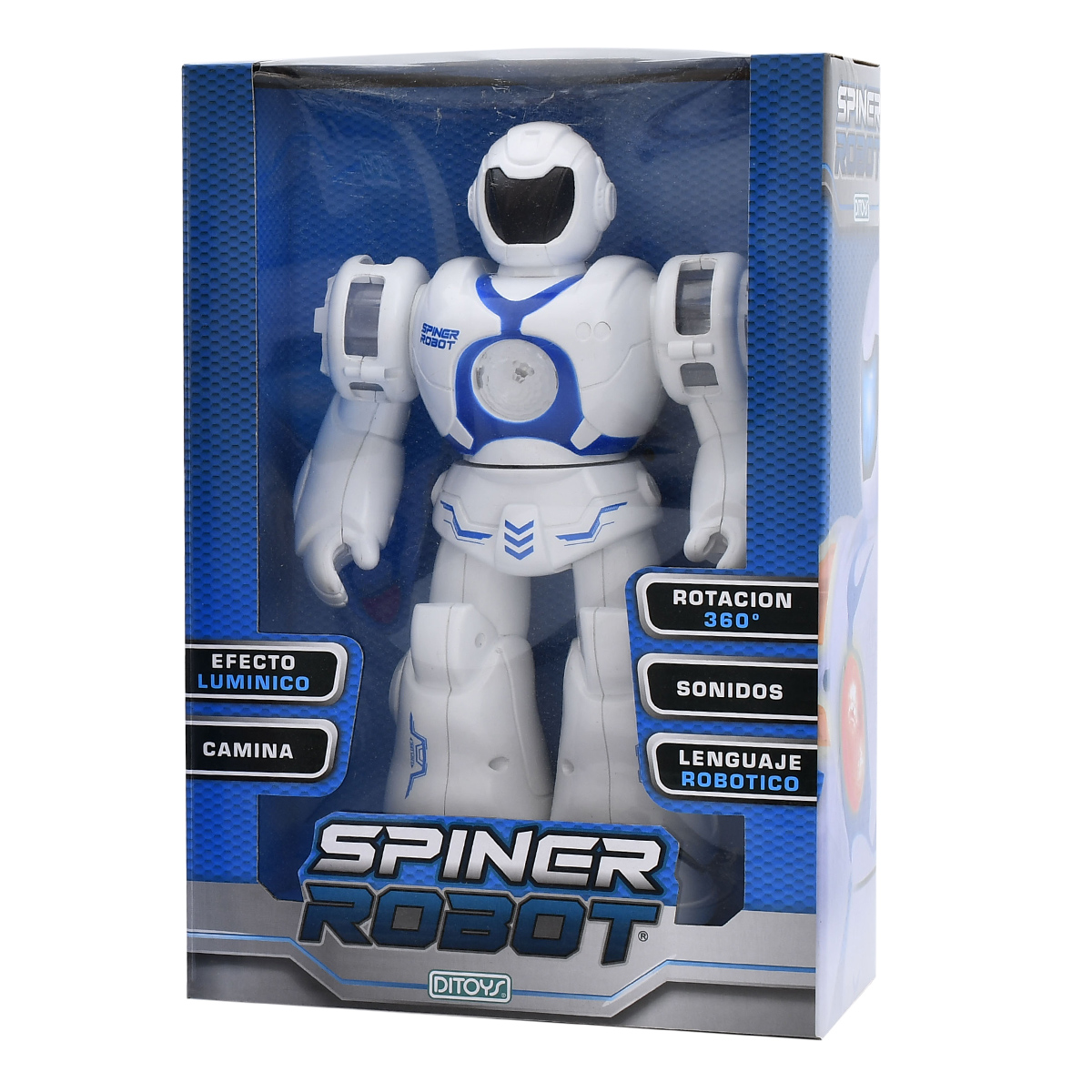 Camina, tiene efectos lumínicos, rotación 360 grados, sonidos y lenguaje robótico.