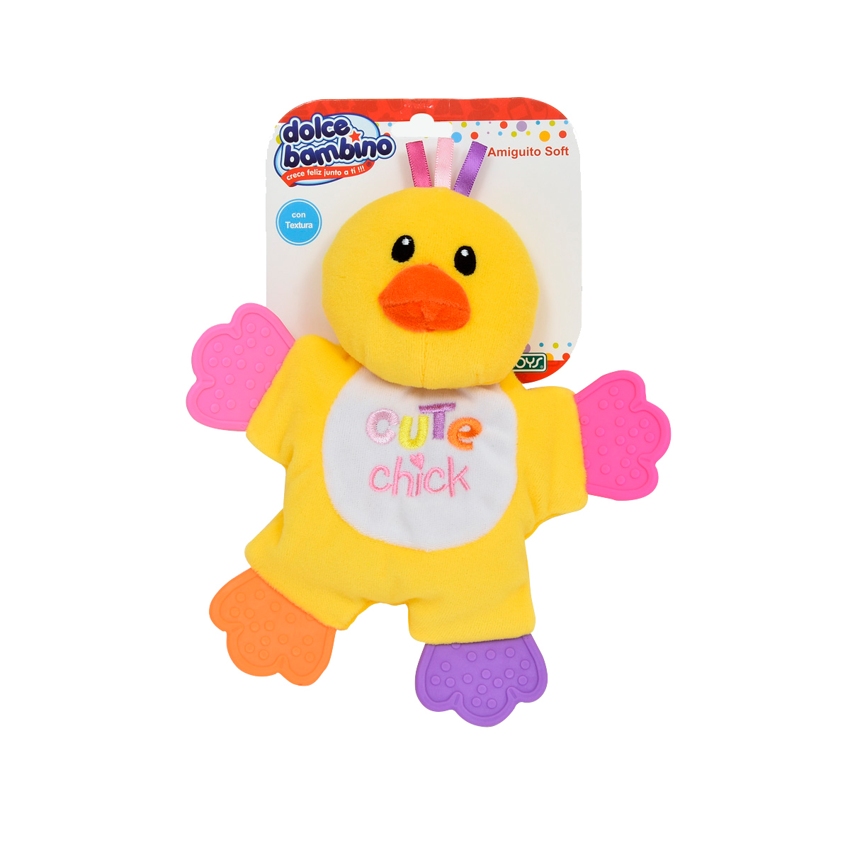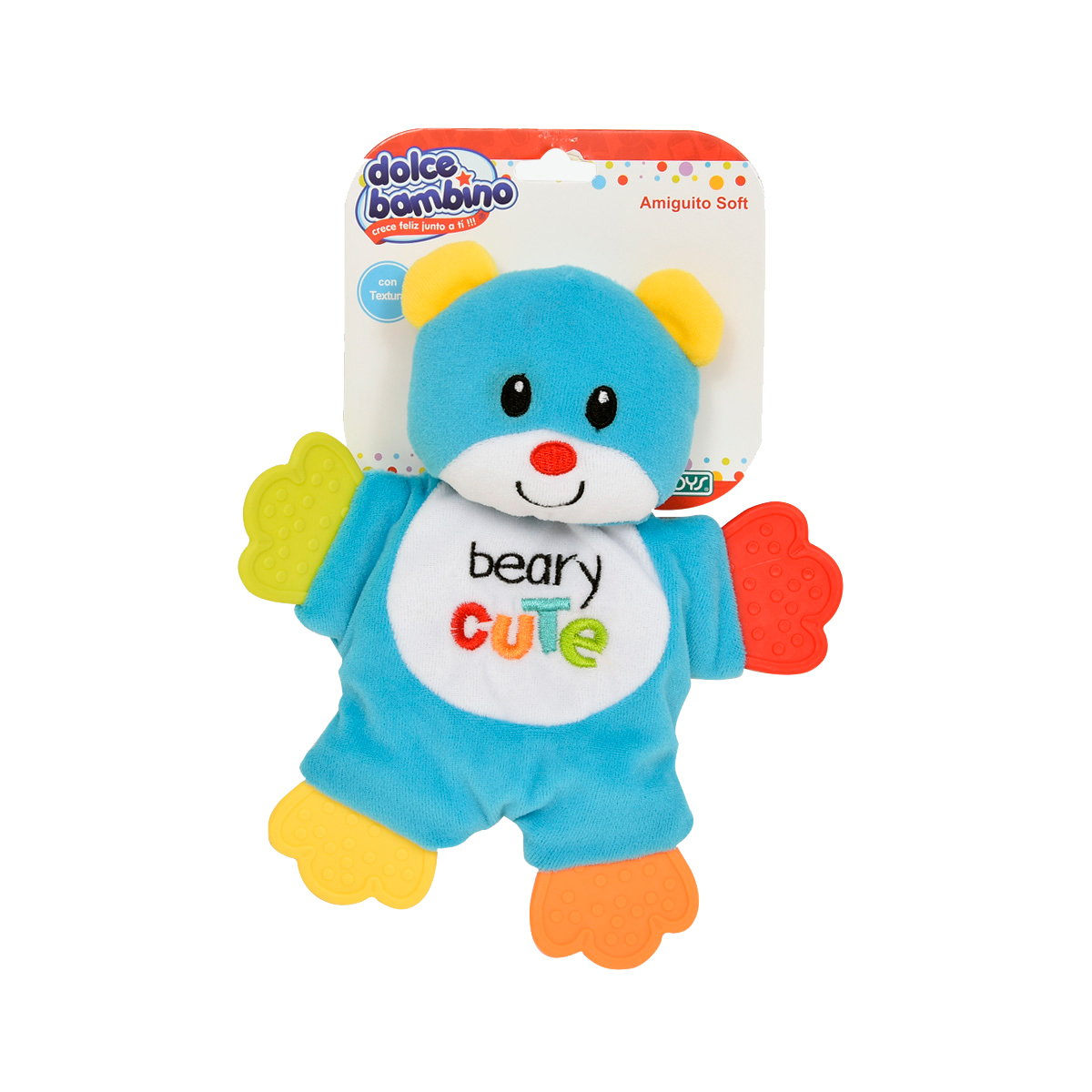 Suave textura para estimular su tacto e incluye colgante para poder dejarselo al alcance en su cuna.