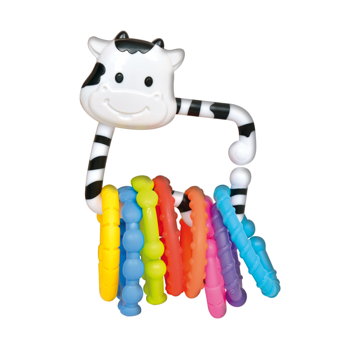 Trae 8 anillos coloridos que al moverse generan un movimiento y sonido que entretienen al niño.