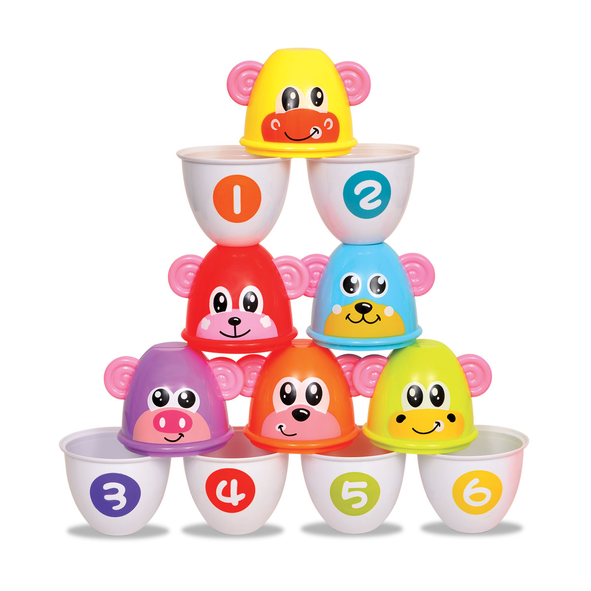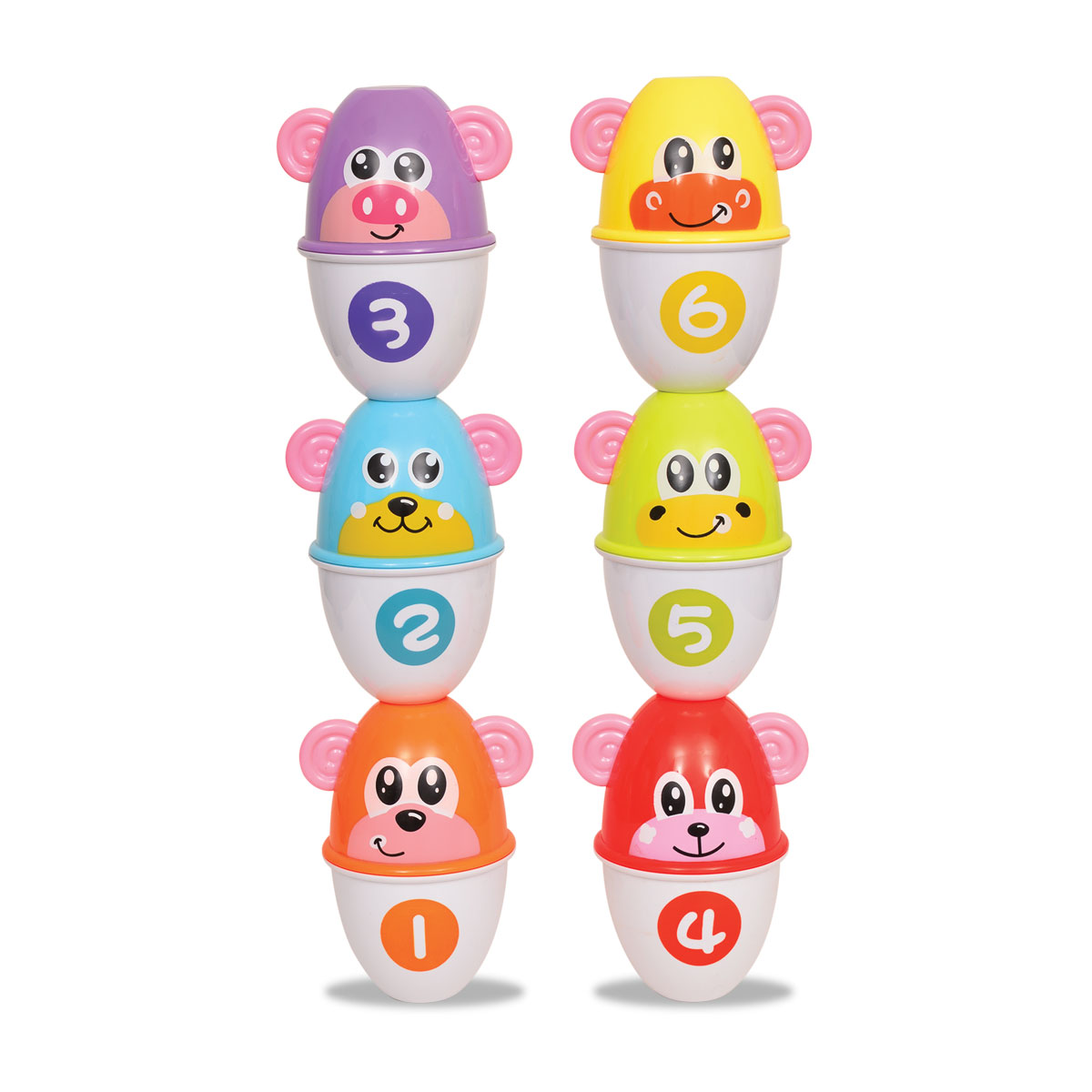 Tiene diferentes formas de apilar, los coloridos animalitos intercambiables.Sus piezas estimulan la creativdad y la cordinación.