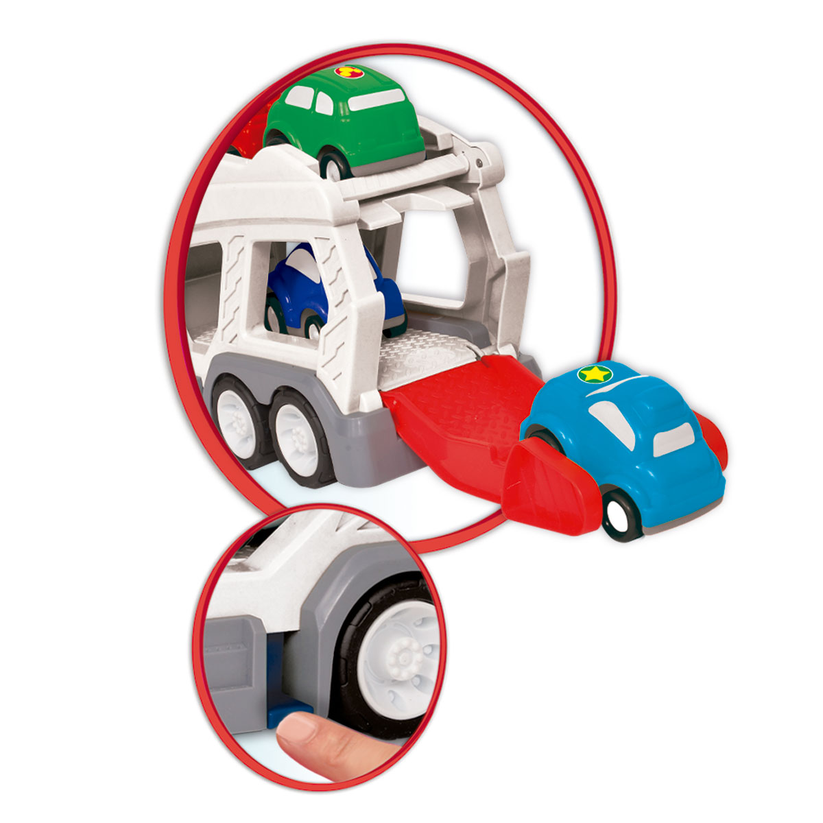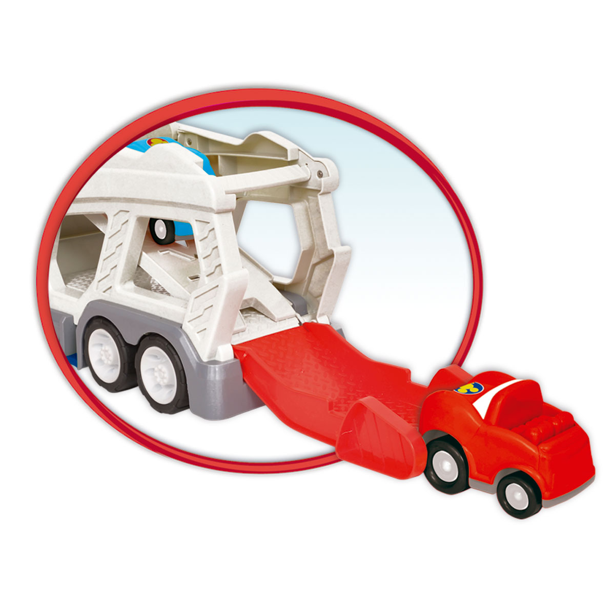 Viene con luz y sonidor real.Podes llevar 4 autos y trae una rampa para bajarlos y subirlos con facilidad.